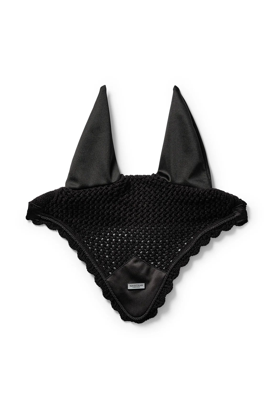 Luxurious, crocheted ear bonnet in a stylish black color. Decorated with a black satin patch on the front, black edge border, and a silver Equestrian Stockholm badge. The ear net provides both insect protection and noise reduction. It has elastic cloth on the ears for extra comfort.