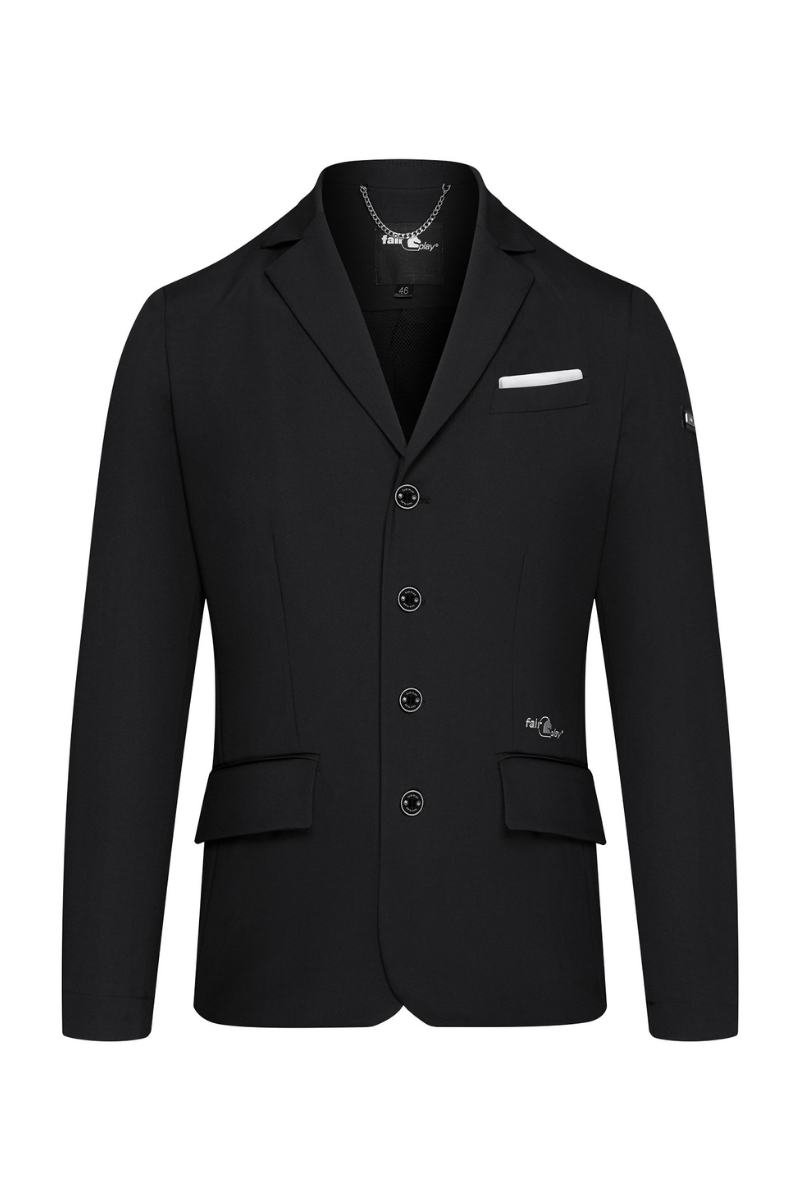 The FairPlay Steve Men's Competition Jacket blends a timeless classic cut with a sporty edge, designed to support your performance in the arena. Crafted from breathable and stretchy COMFINAT-tech fabric, it ensures comfort and freedom of movement. The mesh lining enhances ventilation, keeping you cool and focused during competition. Perfect for riders seeking both style and functionality in one jacket.