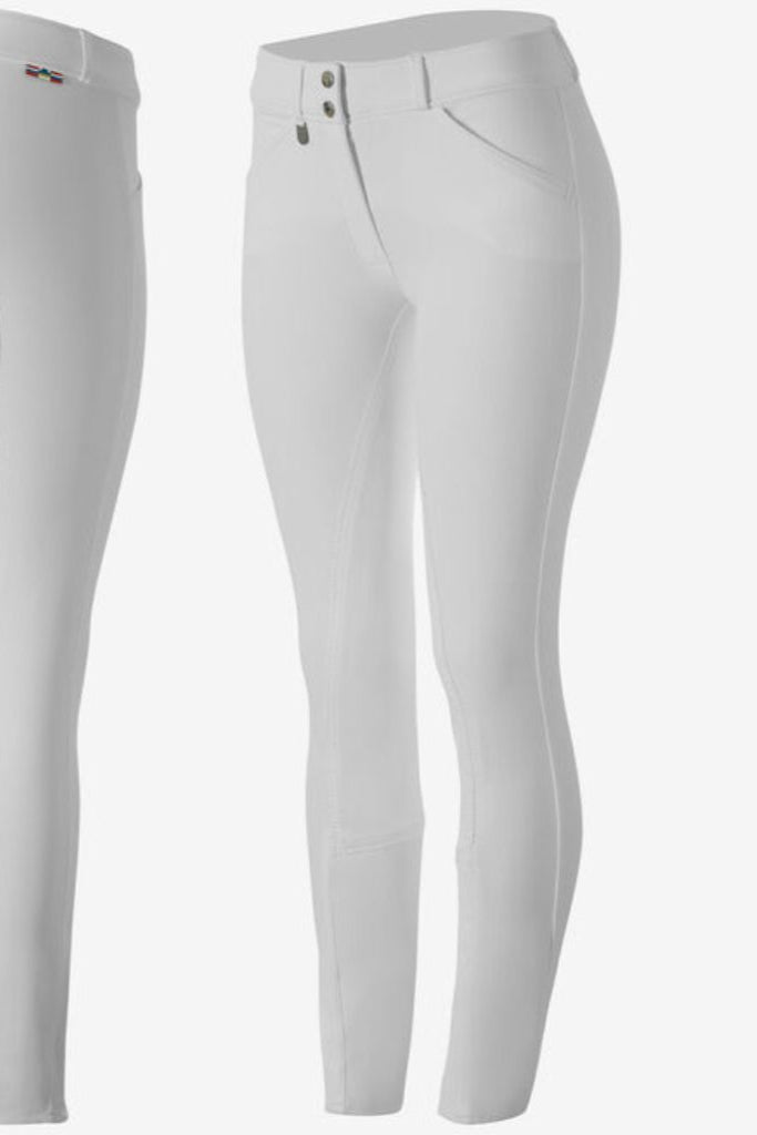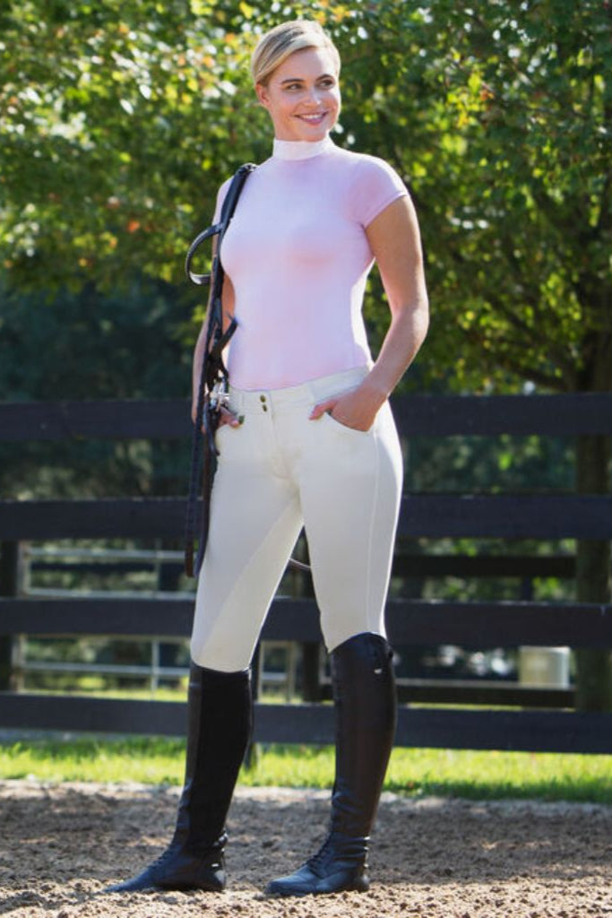 Breathable fabric with a water and dirt repellent surface looks great all day and keeps dust from sticking. The leather-like full seat stretches as you ride and provides security and super grip in the saddle. Ultra thin elastic leg bottoms will lie flat under your favorite tall boots or chaps. Our ever-popular Grand Prix styling is a classic choice for top athletic riders, and equestrians of all ages and disciplines will recognize your impeccable taste.
