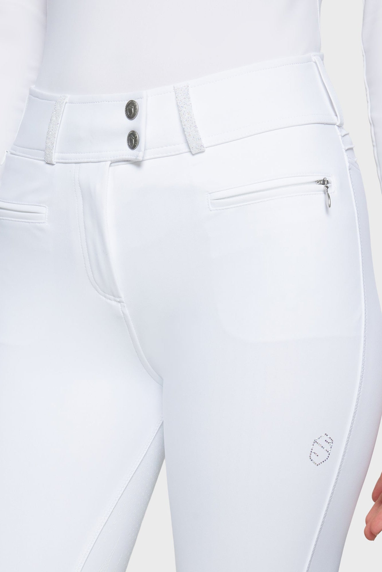 Claranova extra high waist women's riding breeches with full seat grip. Designed for riders looking for a functional style with crystals, these pants combine a second skin effect, resistance and performance for all disciplines.